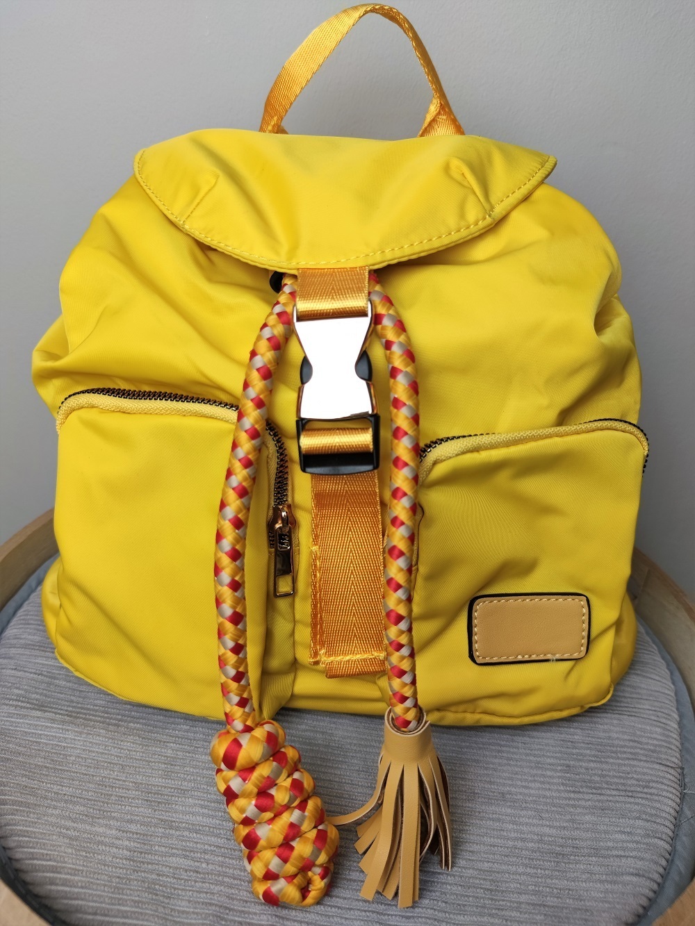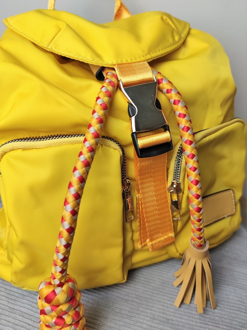 Mochila amarilla con dos bolsillos delanteros, abertura principal decorada con cuerdas, bolsillo interior y trasero. Mochila amplia y cómoda.